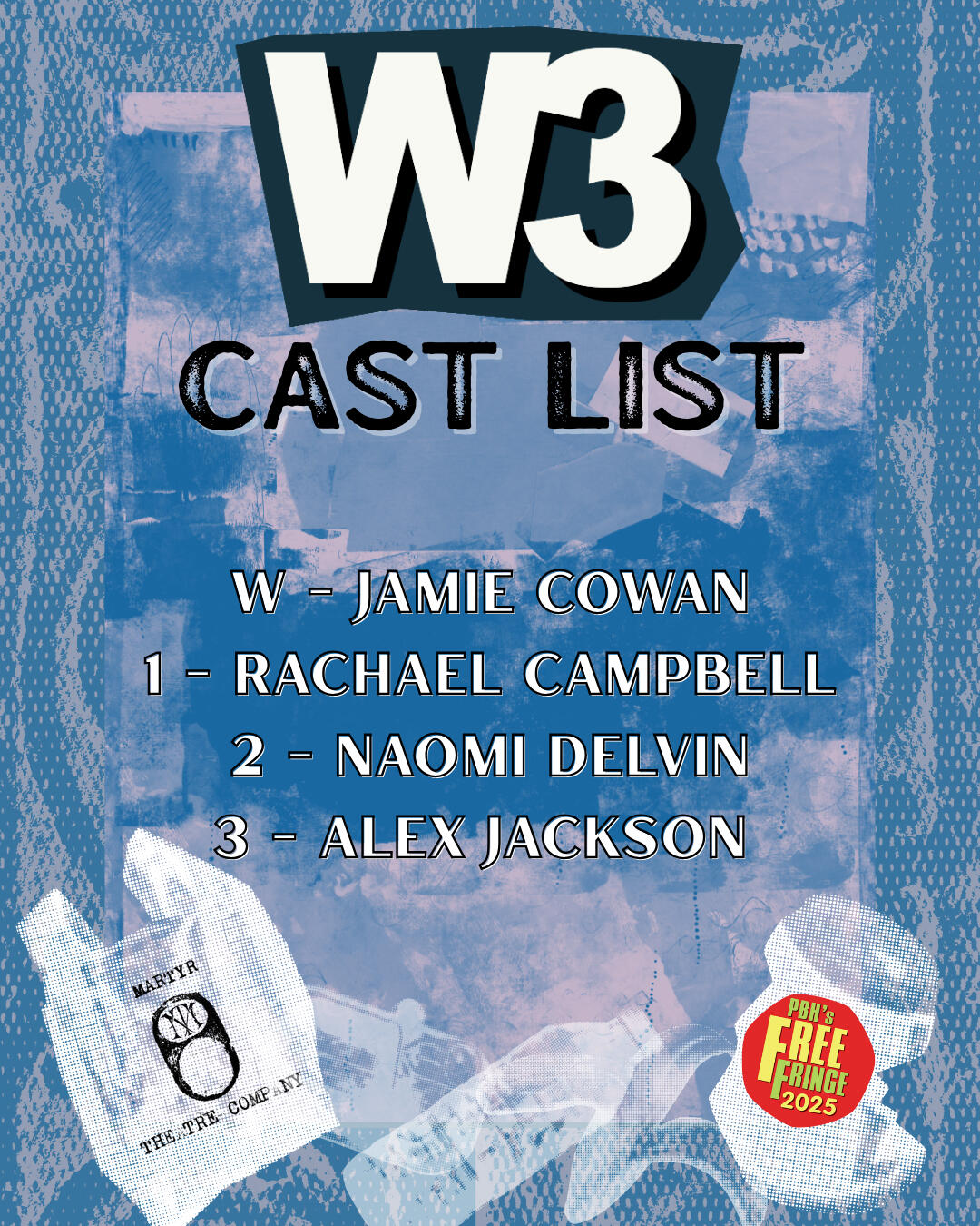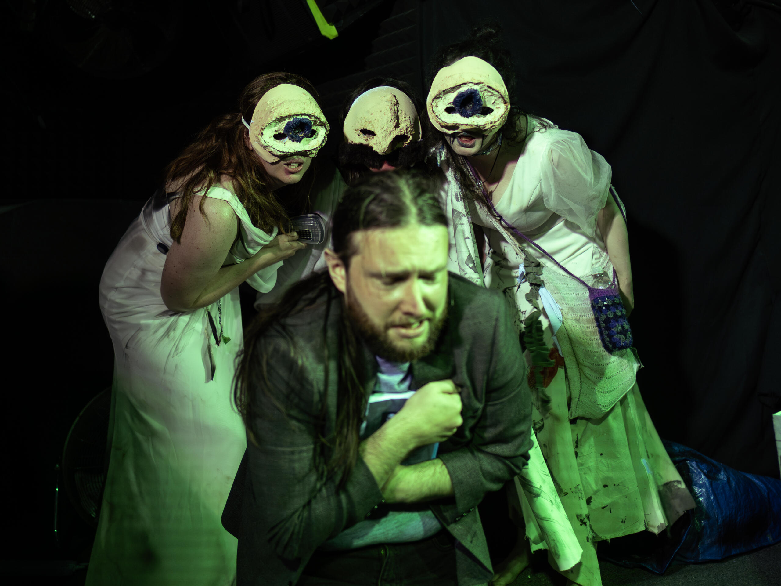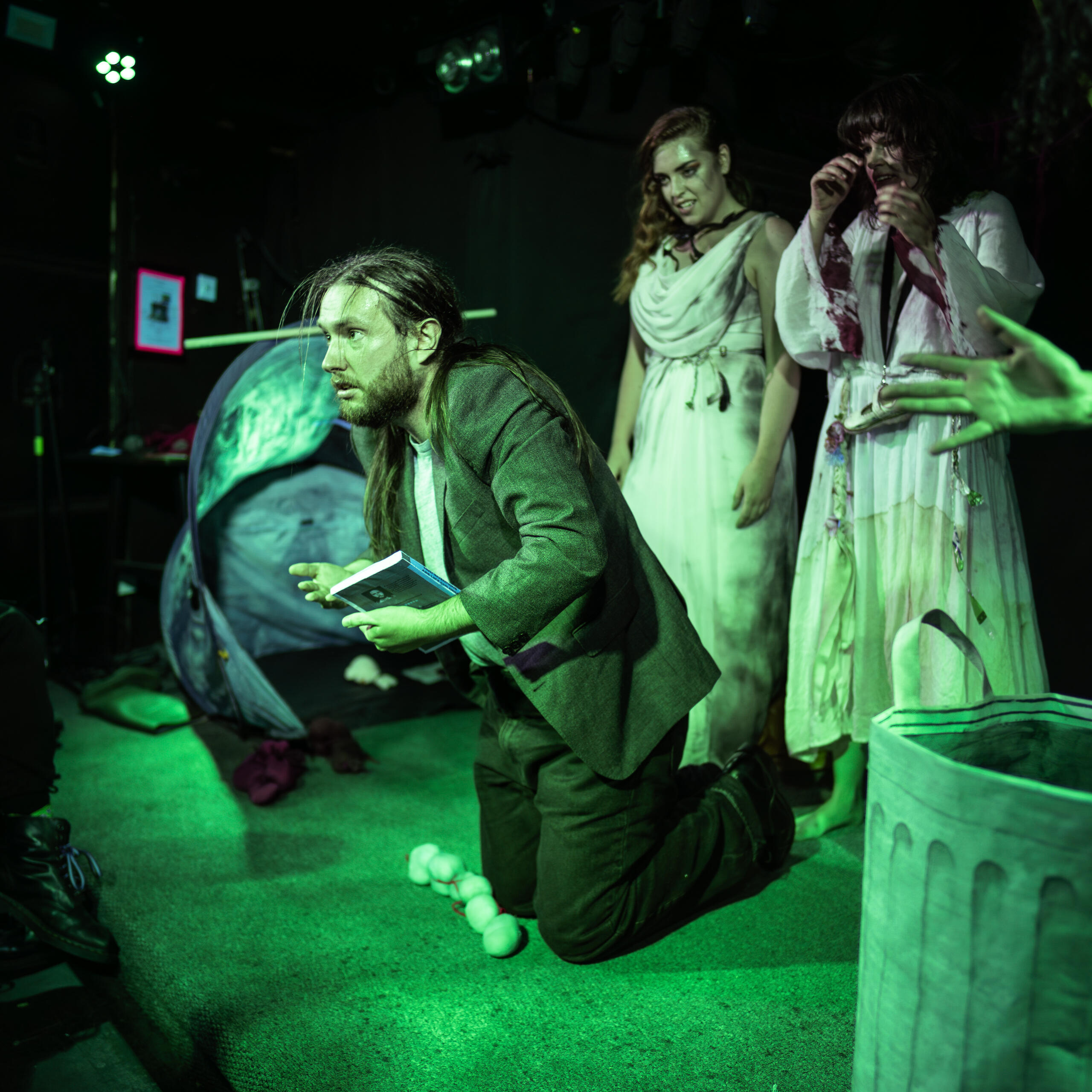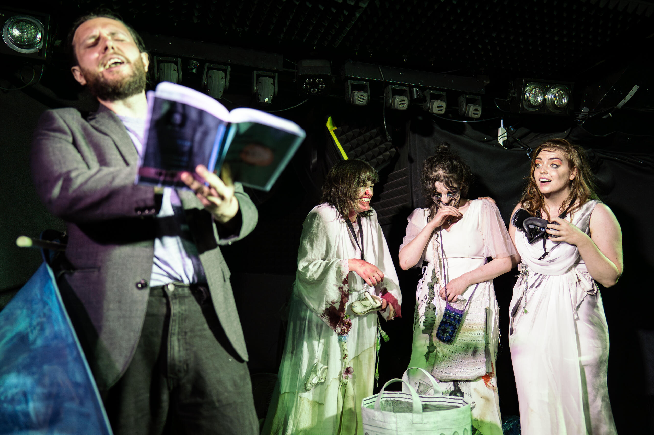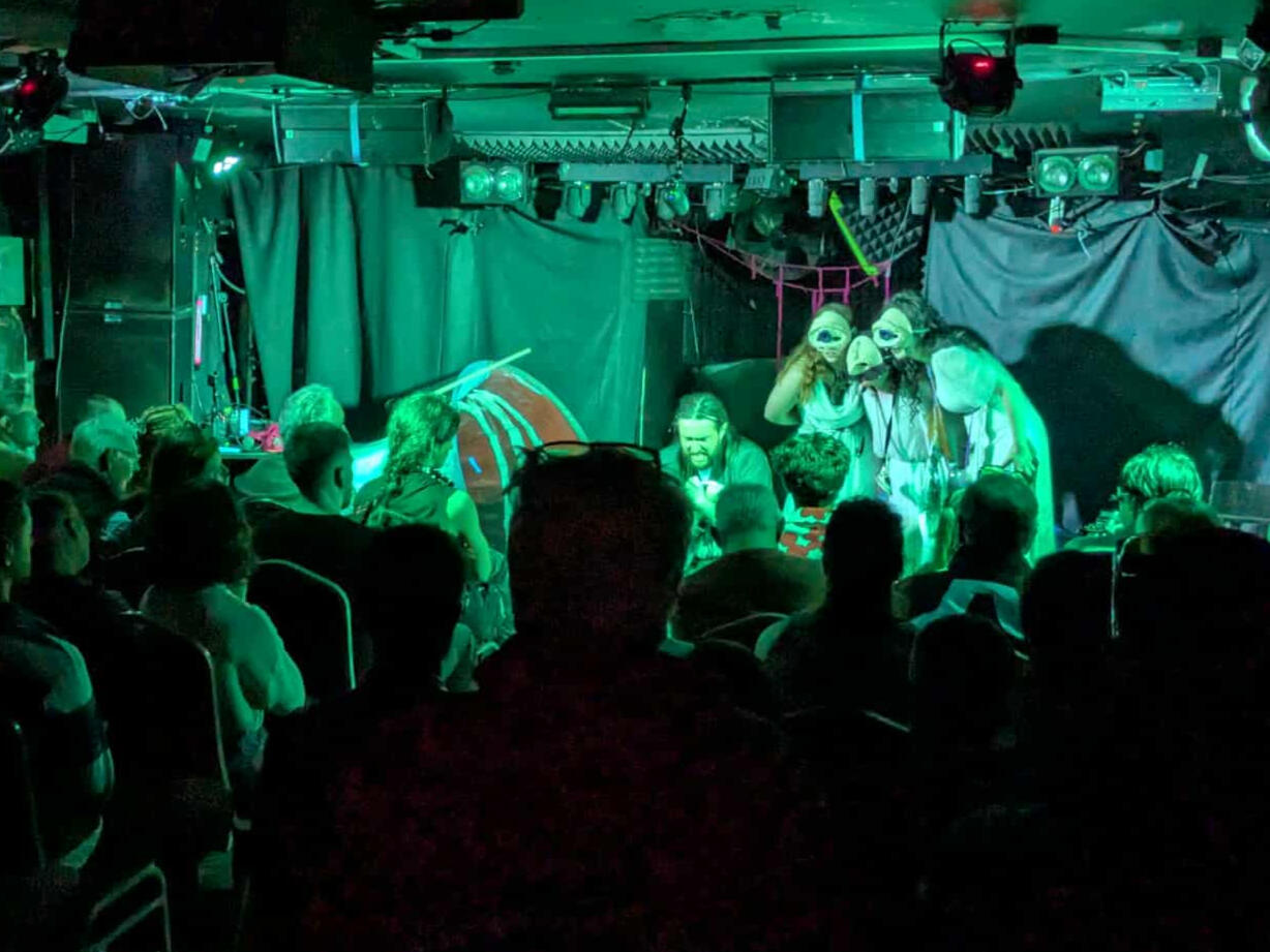 Three wyrd sisters, one grifter, and a dead whale. Mixing puppetry and actors, W3 tells the tale of three trash-picking witches and a washed-up inventor whose baby is killing their mother. This semi-shakeperian play received ★★★★ from DC Theatre Arts in 2014, and was revived (and re-invigorated) for a UK Debut at PBH's Free Fringe in 2025.